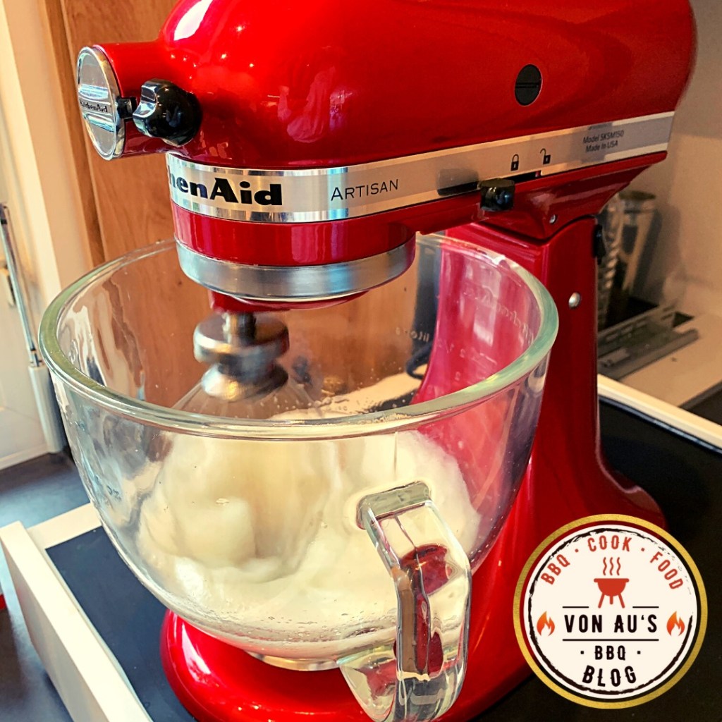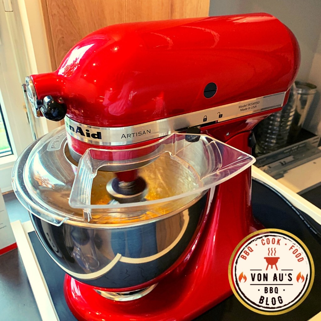 - Butter mit den 3 Eigelb, den zwei ganzen Eiern und einer Prise Salz mit dem Schneebesen in der KitchenAid bzw. mit dem Rührgerät schaumig schlagen.