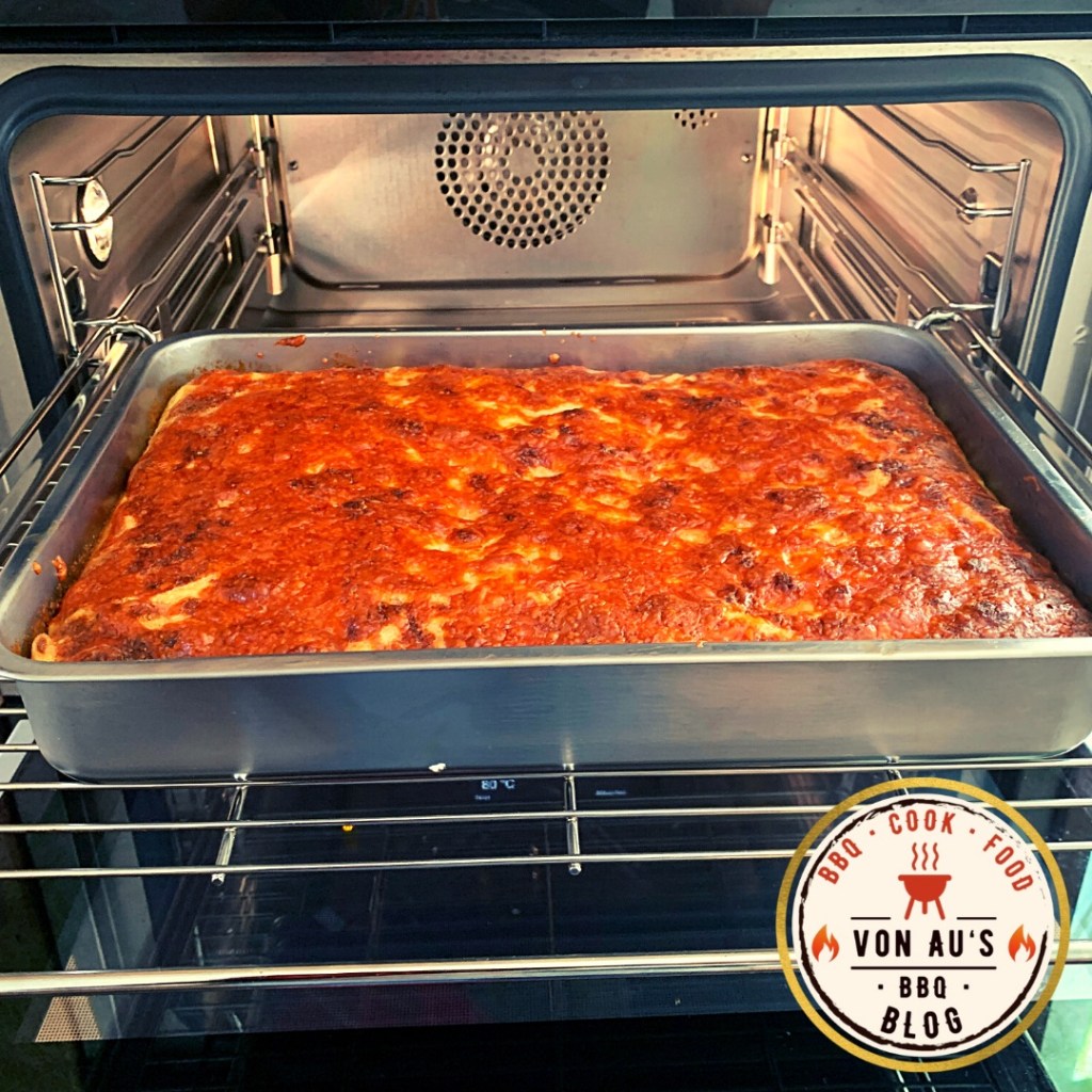 - Heißluft mit Schale Wasser im Backofen bei 170 Grad Celcius für ca. 25 Minuten und anschließend den Grill beim Backofen zuschalten für ca. 10 Minuten