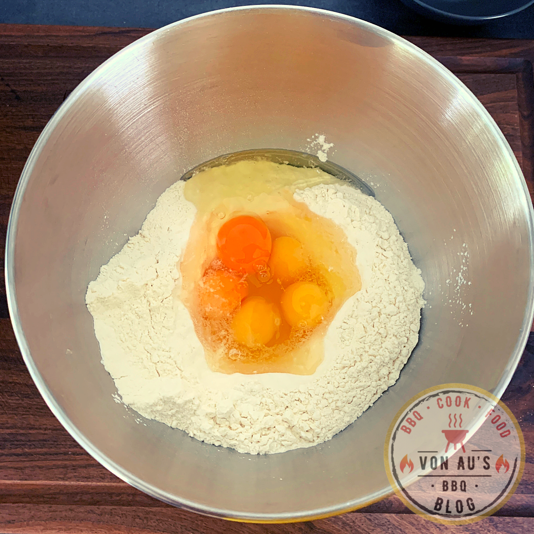 - Mehl und Salz vermischen, eine Mulde eindrücken und die Eier hineingleiten lassen.