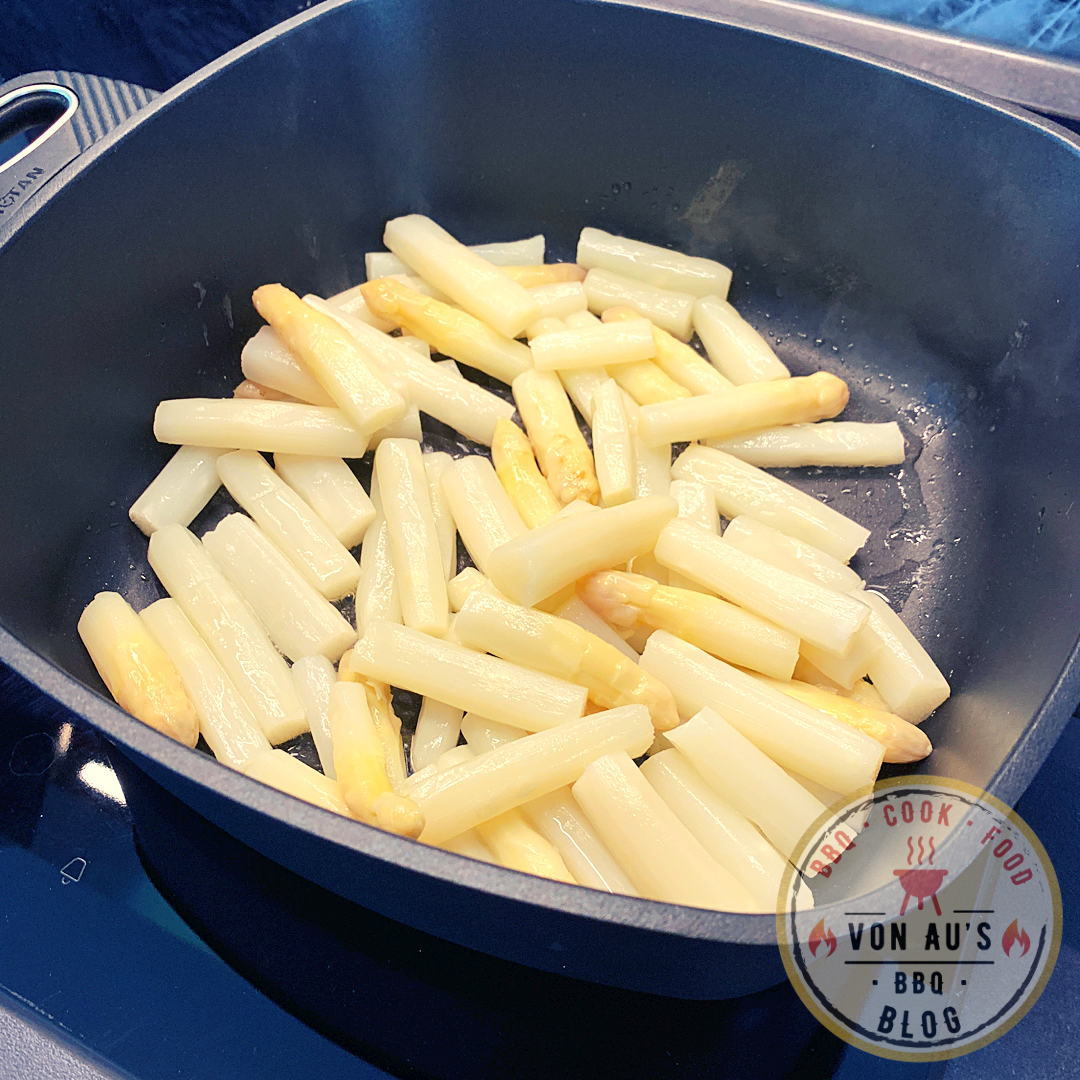 - Den Spargel bei mittlerer Hitze für etwa 8 – 10 Minuten rundherum goldbraun anbraten.