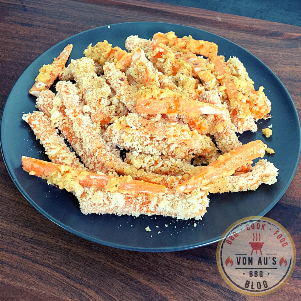- Sobald die Karottensticks knusprig und goldbraun sind, vom Grill nehmen.