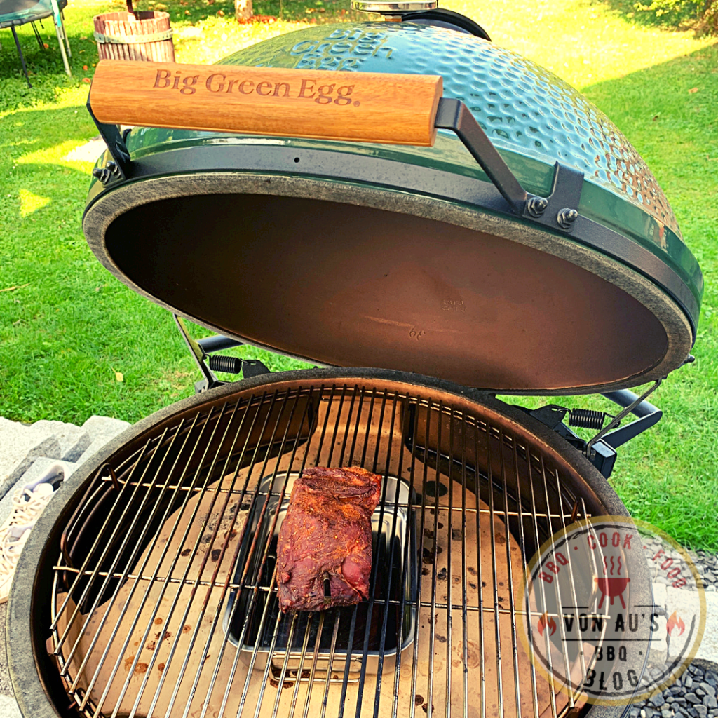 Jetzt ist es an der Zeit, den Grill anzufeuern. Auf deinem Big Green Egg stellst du die Temperatur auf ca. 100 °C ein. Das Roastbeef aus dem Kühlschrank holen, um es zu temperieren. Es kommt anschließend auf den Rost mit eingesetztem ConvEGGtor und wird langsam bei indirekter Hitze gegart. Ein Fleischthermometer, ich nutze den MEATER, ist hier unverzichtbar, um die Kerntemperatur von 60 °C zu erreichen. Dies sorgt für ein perfekt gegartes, saftiges Roastbeef.