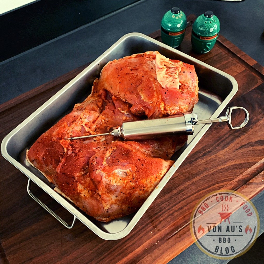 Nun zum spannenden Teil: dem Grillen des Spanferkelbratens. Bevor du das Fleisch auf den Grill legst, ist es wichtig, die Schwarte mit einer großzügigen Menge Salz zu bestreuen. Das Salz hilft, die Schwarte knusprig zu machen und verleiht dem Braten zusätzlichen Geschmack. Massiere das Salz gründlich in die Schwarte ein und stelle sicher, dass es gut haftet. Des Weiteren spritze mit meiner Marinadenspritze* Brühe in das Fleisch. Dadurch bleibt es schön saftig.