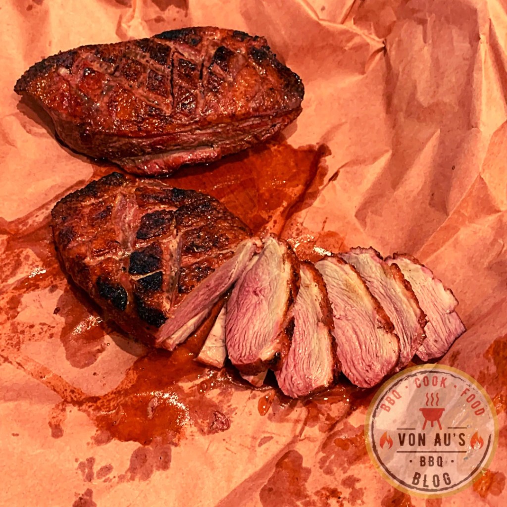 - Nehme die gegrillten Entenbrüste vom Grill und lasse sie für ein paar Minuten ruhen. Am Besten in Butcher-Paper einwickeln.