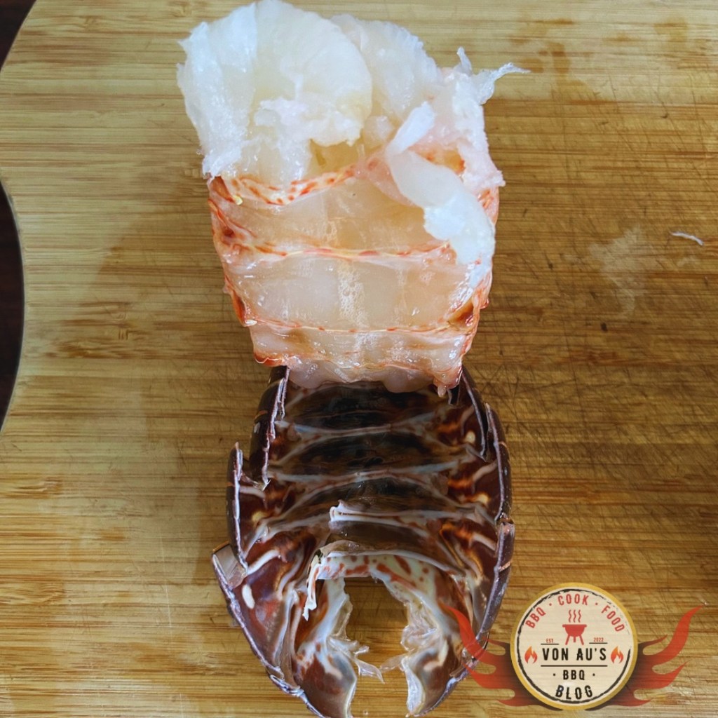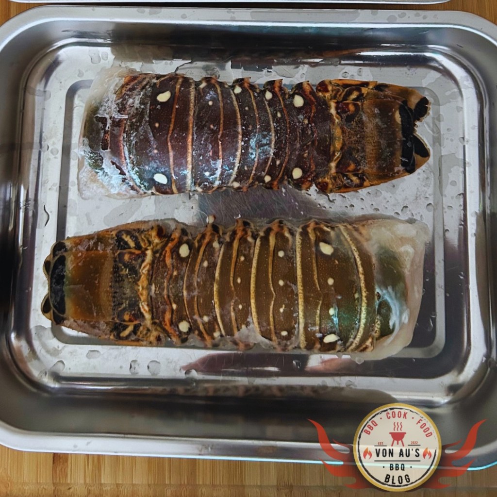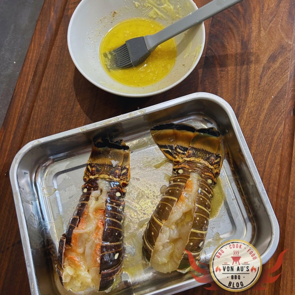 Mit meinen vorbereiteten Langustenschwänzen und der aromatischen Limettenbutter begebe ich mich zu meinem Big Green Egg. Ich heize ihn auf etwa 180 – 200°C direkte Hitze vor und platziere die Langustenschwänze mit der Fleischseite nach unten direkt auf dem Rost.