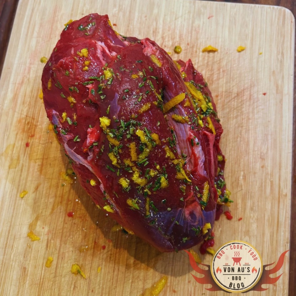 - Orangenschale, den Knoblauch und den Rosmarin mit 3 EL Öl vermischen und die Kugel damit einreiben.
