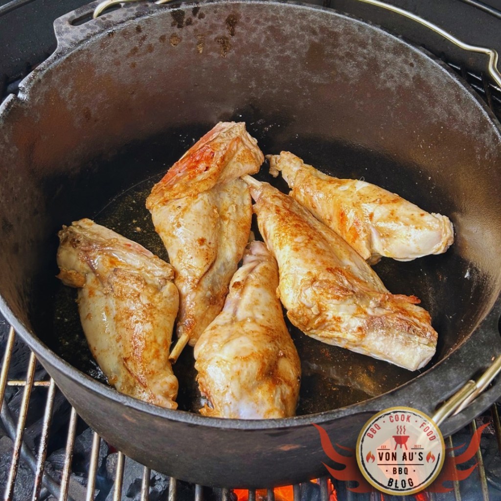 Im Dutch Oven* wurden zuerst die Kaninchenschenkel angebraten, bis sie von allen Seiten eine schöne goldbraune Farbe hatte. Danach kamen die Zwiebeln und der Knoblauch hinzu, die unter ständigem Rühren glasig gedünstet wurden. Anschließend wurden die restlichen Gemüse und die Kräuter hinzugefügt.