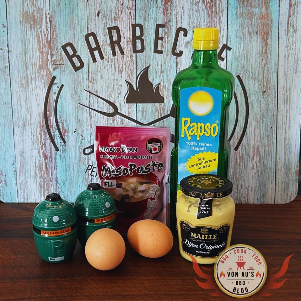 1. Die Eigelbe, das Miso, Zitronensaft und den Senf in eine Schüssel geben.