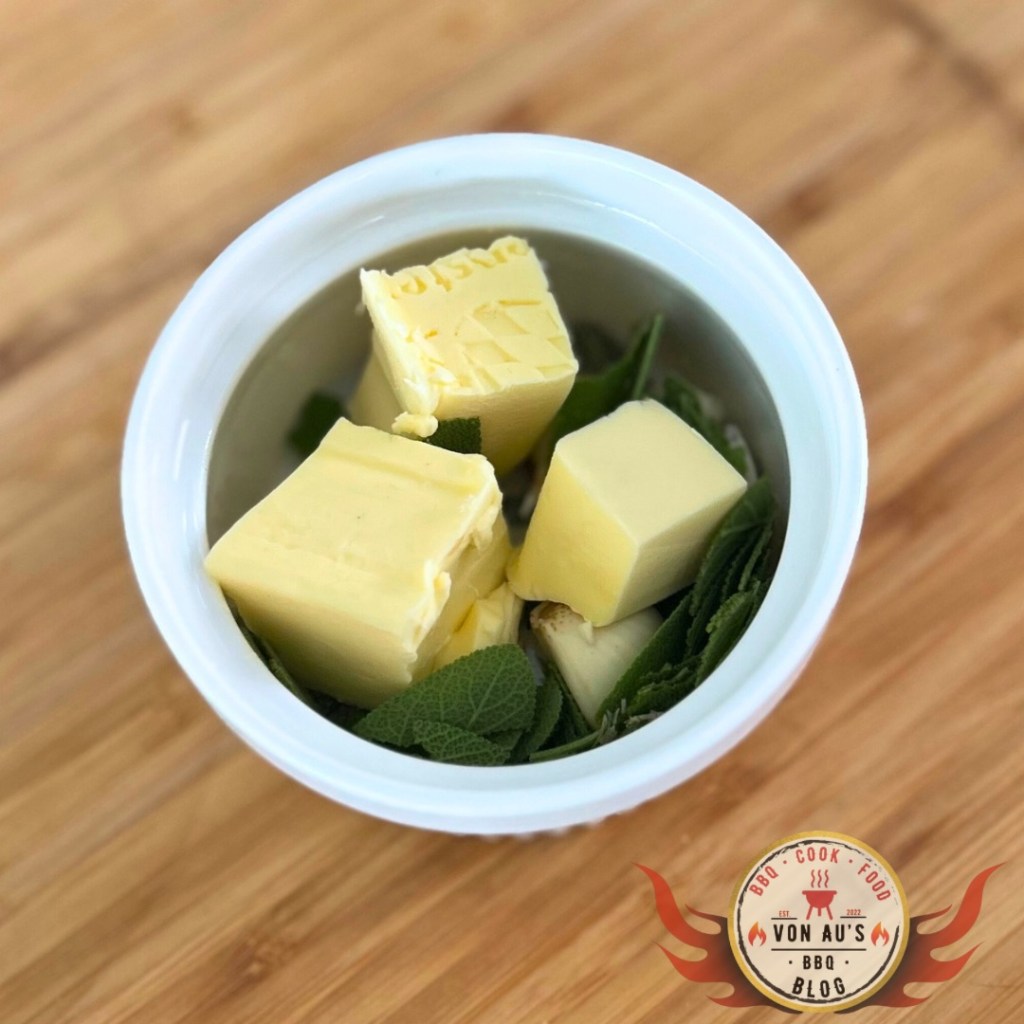 - Schälchen auf den Grill oder auf den Warmhalterost stellen und schmelzen lassen, während das Fleisch gart.