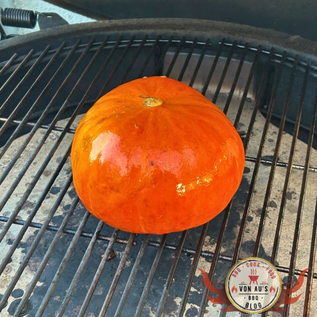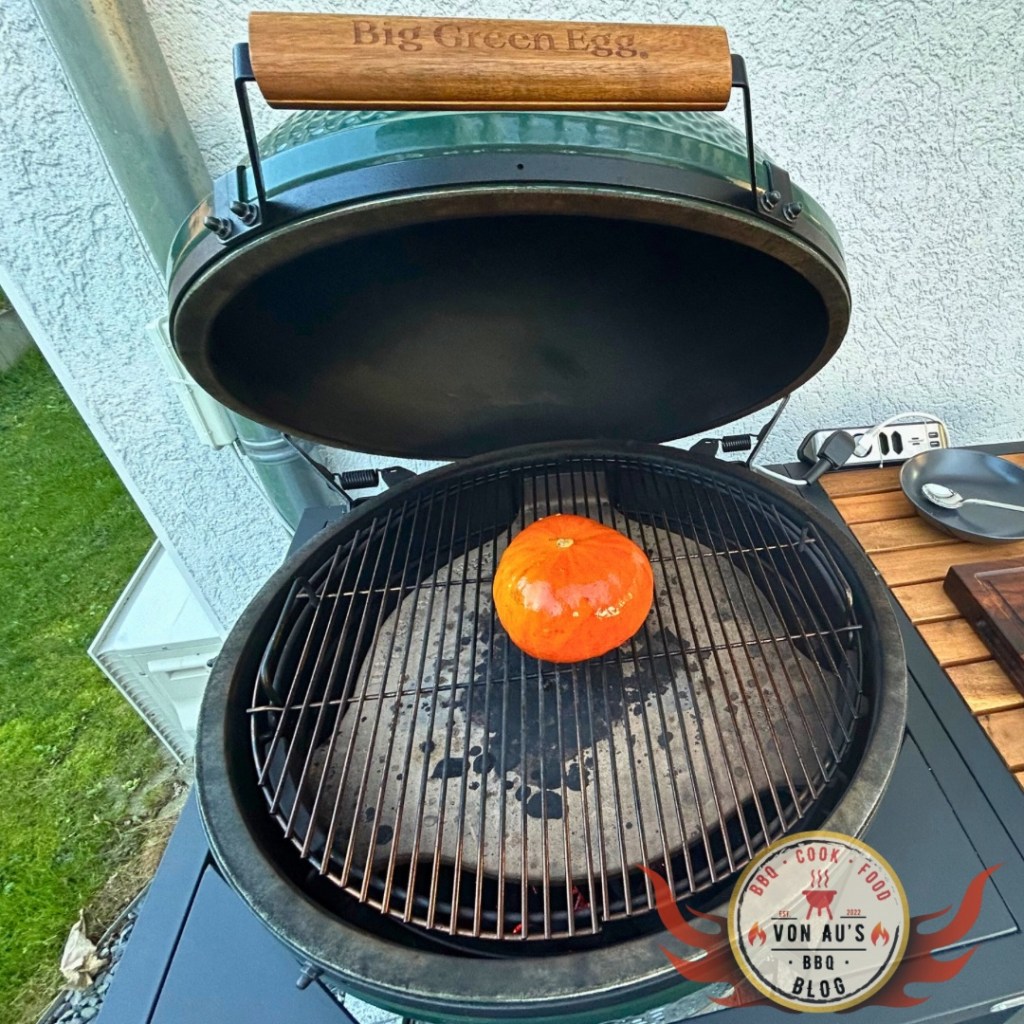 Der Kürbis sollte schön durchgegart sein, bevor ich ihn füllt. Deshalb legte ich ihn im Ganzen für die ersten 30 Minuten bei 180 °C indirekter Hitze auf das Big Green Egg. So wird der Kürbis weich, und die Aromen beginnen, sich zu entfalten – von außen röstig, von innen saftig.