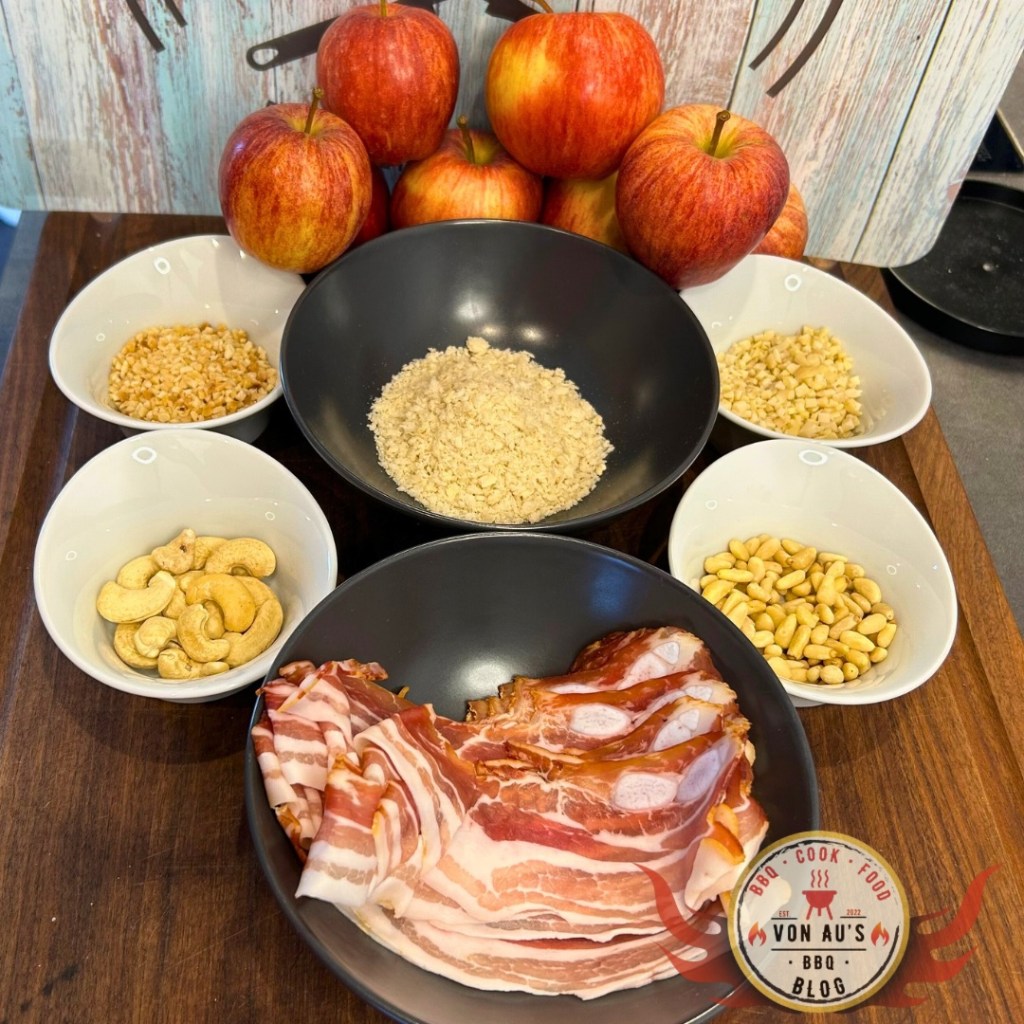 - Füllung in die Äpfel geben und 2 Scheiben Frühstücksspeck horizontal um jeden Apfel wickeln