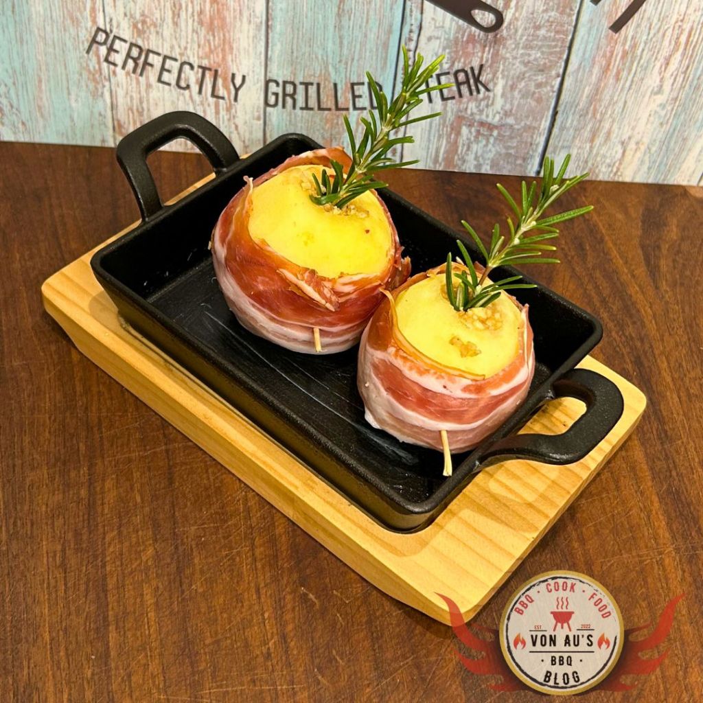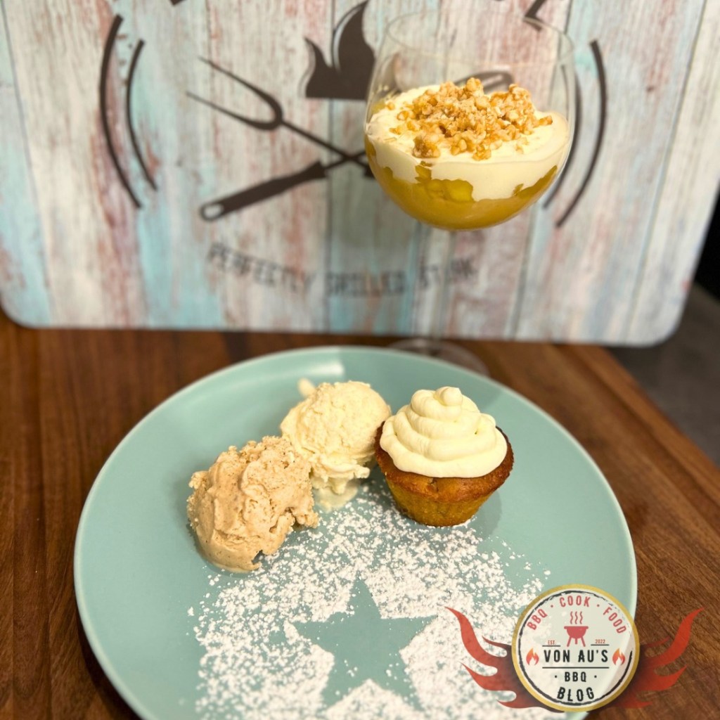 Die Bratäpfel wurden mit Pinienkerne, weißen Mandeln, Cashewnüssen, weißen Haselnüssen und etwas Panko gefüllt. Der um die Äpfel gewickelte Speck und etwas Barbecuesauce BBQUE „Das Original“* rundeten das Gericht auf vollendete Weise ab. Die Bratäpfel waren der perfekte Abschluss der Hauptspeise.