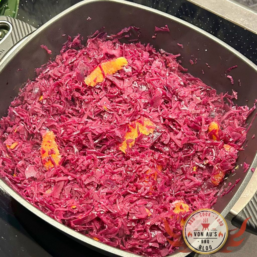 Dazu gab es Honig-Orangen-Rotkraut, fluffige Semmelknödel und gefüllte Bratäpfel. Der Rotkohl wurde mit frisch gepresstem Orangensaft und Honig verfeinert, was ihm eine herrlich fruchtige Note verlieh. Der fein geschnittene Rotkohl wurde in Schweineschmalz und Zwiebeln angeschwitzt, bevor ich ihn mit frisch gepresstem Orangensaft, Honig und einem Schuss Himbeeressig verfeinerte. Die Kombination aus Süße und fruchtiger Frische harmonierte perfekt mit der Gans.