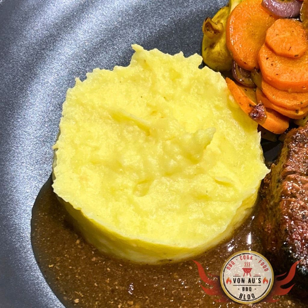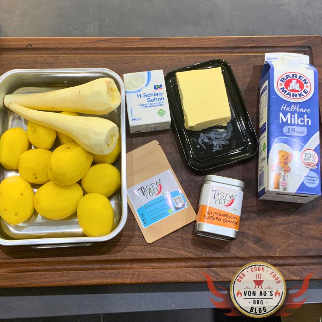 - Kartoffeln und Pastinaken mit einem Stampfer oder einer Kartoffelpresse fein pürieren.
