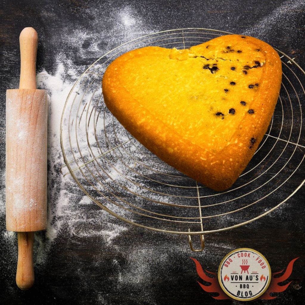 - Den Teig in die Herzform geben und ca. 30-35 Minuten backen, bis er goldbraun ist (Stäbchenprobe machen).