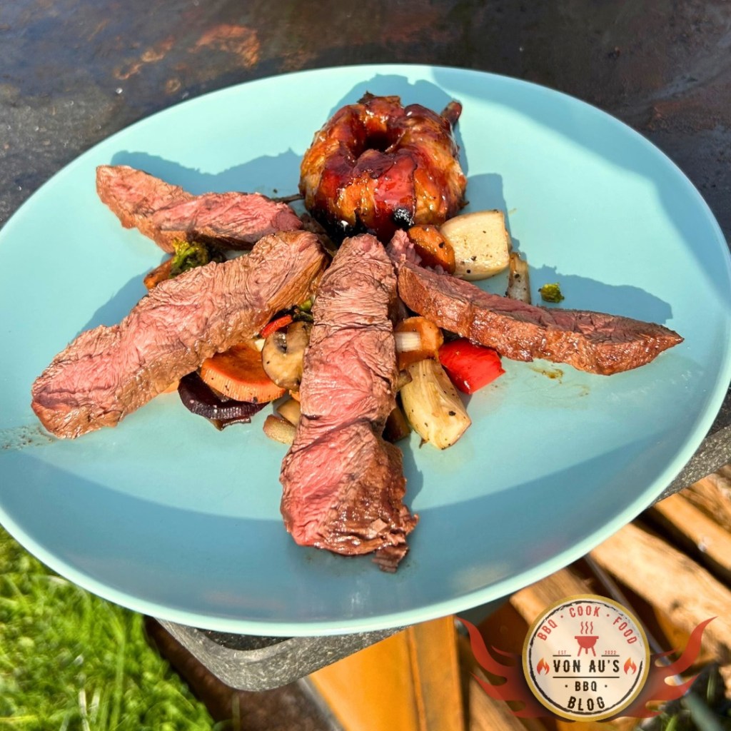8. Grill auf indirekte 180–200 °C einregeln und die Bacon Zwiebelringe im indirekten Bereich platzieren. Dort ca. 20 Minuten grillen.