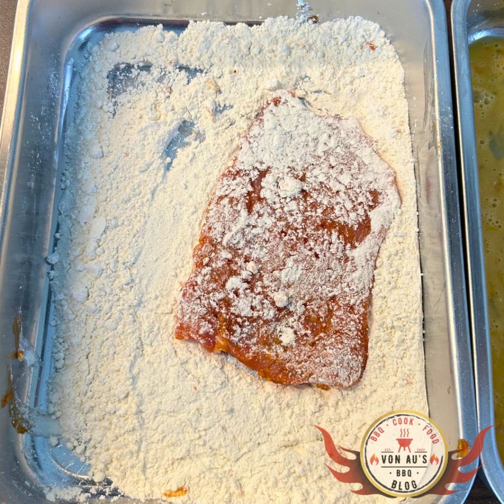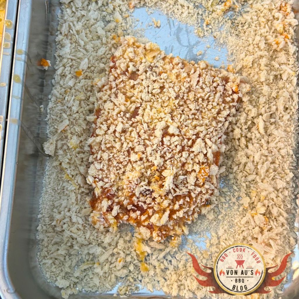 Für das Schnitzel habe ich mich entschieden, es mit der Sweet-Bacon-Marinade* von SizzleBrother* zu marinieren. Dies war eine der besten Entscheidungen, die ich bei diesem Rezept getroffen habe. Die Marinade bringt eine wunderbar rauchige und süßliche Note ins Spiel, die perfekt mit der knusprigen Panade harmoniert.
