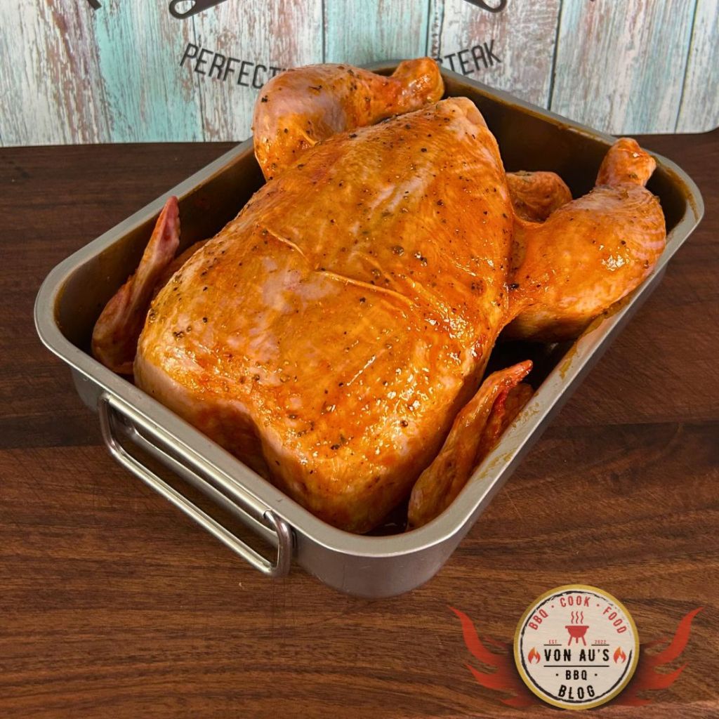 Und als Geheimwaffe: „Knobifreund*“-Öl von Die Ölfreunde*. Ich habe es unter die Haut massiert, direkt auf die Brust und Keulen. Dieser Schritt macht den Unterschied: Das Öl schmilzt beim Garen, gibt das feine Knoblaucharoma ab und sorgt für diese fantastische Saftigkeit, die du sonst nur bei Rotisserie-Hähnchen bekommst.
