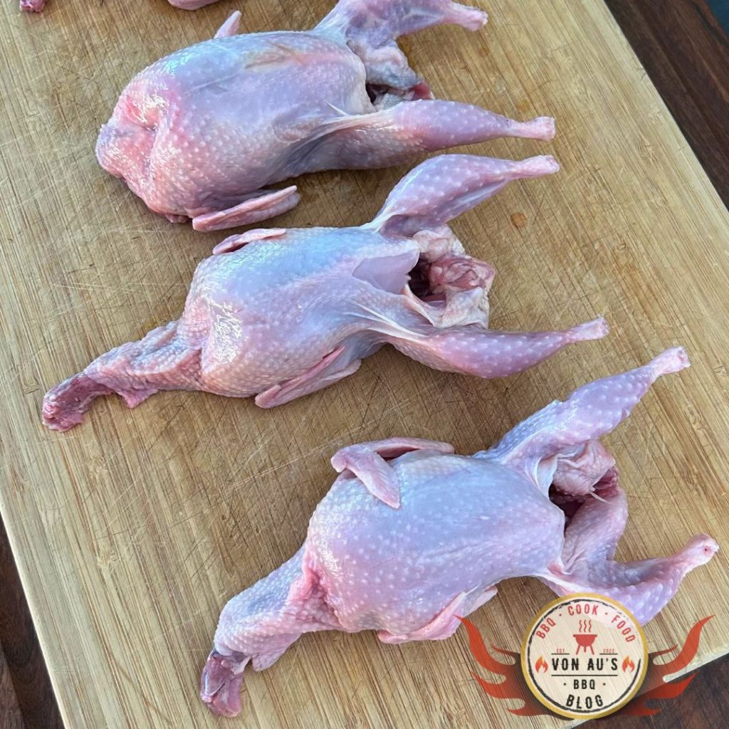 Schon beim Vorbereiten spürte ich, dass diese Zubereitung ein kleines kulinarisches Highlight werden könnte. Ich entschied mich dafür, die Wachteln nicht zu zerlegen, sondern sie im Ganzen zuzubereiten – ein echter Hingucker auf dem Teller und für mich persönlich die ursprünglichste Art, dieses Geflügel zuzubereiten. Die Haut blieb dran, das Skelett intakt – und damit war klar: Ich brauchte eine Marinade, die sowohl würzig als auch fein abgestimmt ist und die Haut schön karamellisieren lässt, ohne das Fleisch zu überlagern.