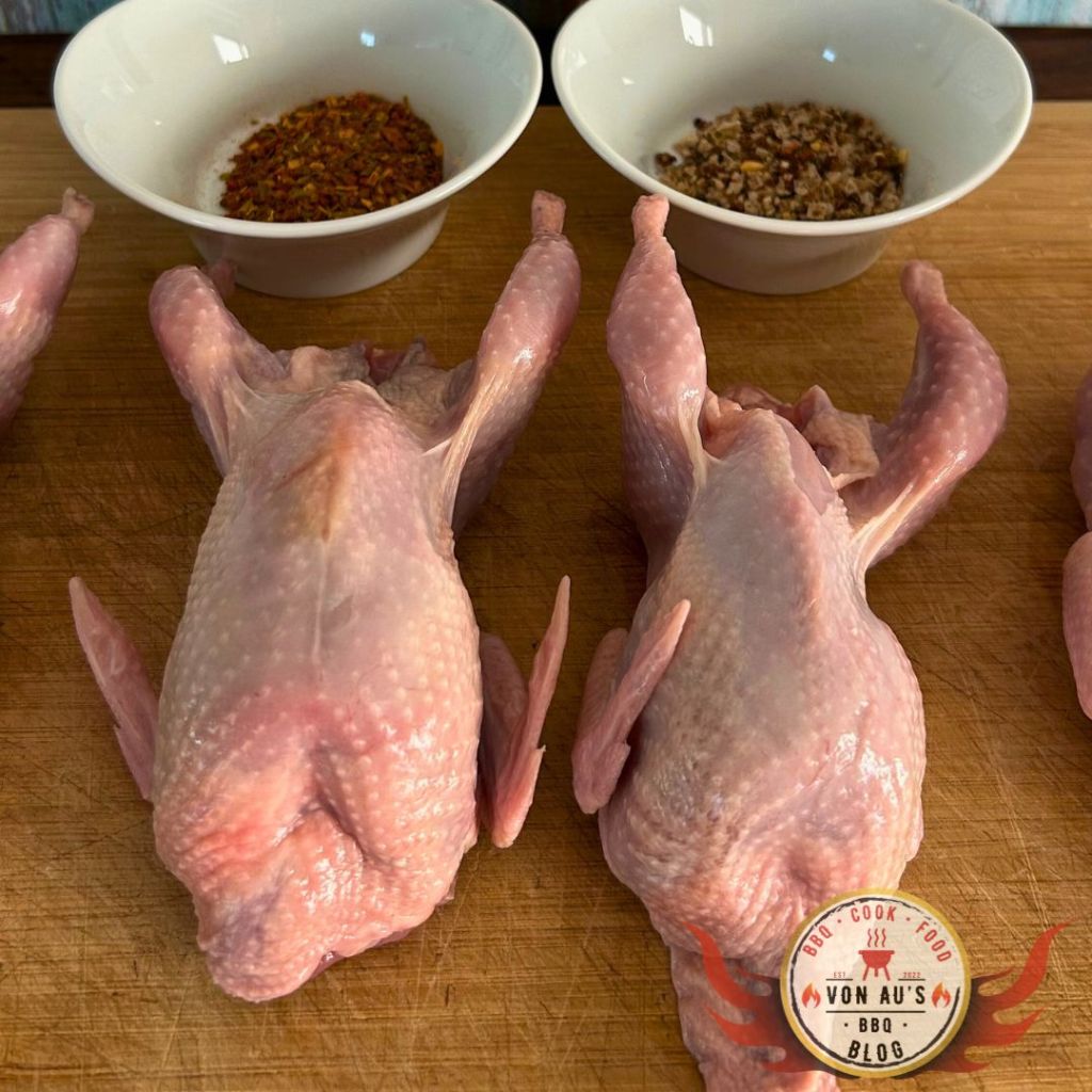 Hier kamen die Gewürzmischungen vom Wachtelhof Odenwald* ins Spiel: Für die Marinade griff ich zur Bio-Wildfleisch-Mischung* sowie Bio-Luxury-Mischung*. Ich habe die Wachteln großzügig mit den Gewürzen eingerieben und sie dann für rund eine Stunde im Kühlschrank ziehen lassen.