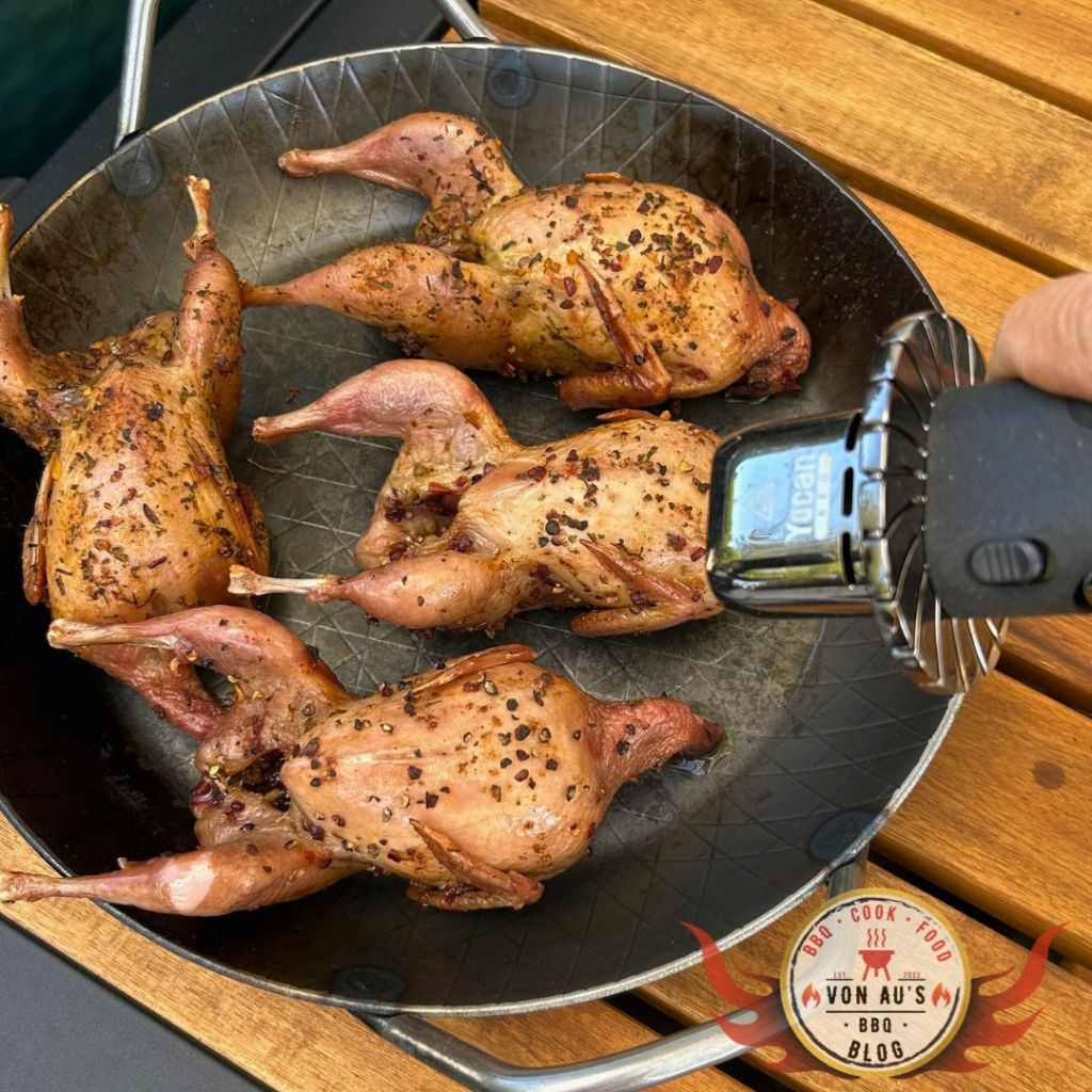Dann war es Zeit für die Wachteln. Ich habe sie auf den Gitterrost gelegt, Brustseite nach oben, und sie etwa 30–35 Minuten bei indirekter Hitze grillen lassen. Währenddessen wurde die Haut goldbraun und knusprig, das Fleisch blieb wunderbar zart. Für den letzten Kick habe ich – wie so oft – zum Yocan Katana* gegriffen und die Haut ganz leicht abgeflämmt. Dieser kleine Extra-Schritt macht nicht nur optisch etwas her, sondern bringt auch ein schönes Röstaroma mit ins Spiel.
