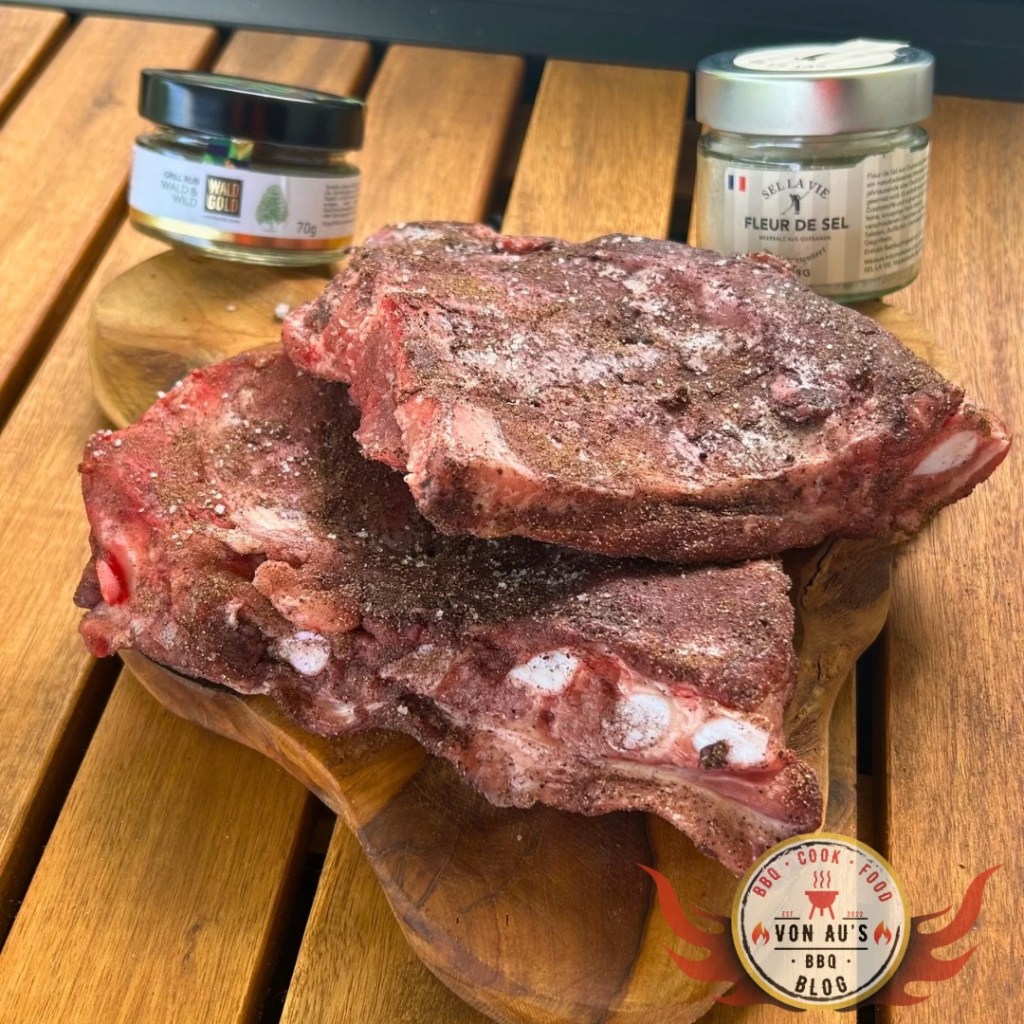 Am Abend vorher habe ich die Rippchen vorbereitet: Silberhaut entfernt, mit dem „Wald & Wild“-Grill Rub* von WALDGOLD* eingerieben und vakuumiert – zusammen mit etwas Butter und einem Zweig Rosmarin. Während der Rub allein schon angenehm würzig duftete, brachte die Kombination aus Bucheckern, Eicheln, Tannennadel (Tanne & Kiefer) und einer leichten Erdigkeit diese Tiefe mit, die perfekt zum nächsten Schritt passte: Brombeersirup und Himbeeressig*.