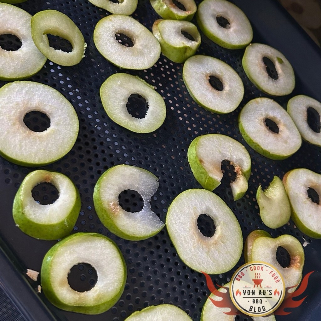 - Zimt, Vanille oder BBQ-Aromen wie geräuchertes Paprikapulver leicht über die Scheiben streuen.