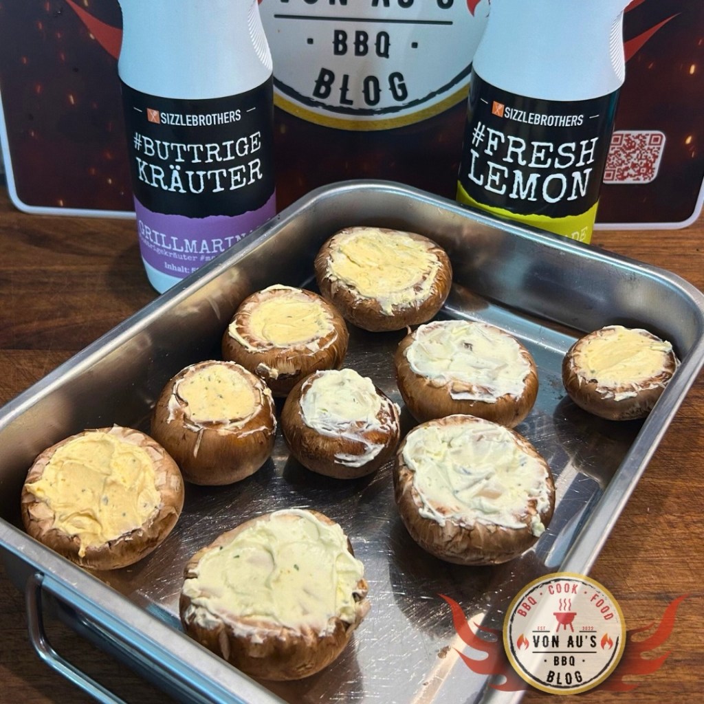 - Champignons füllen, bei 180–200 °C indirekt grillen (ca. 15–20 Min).