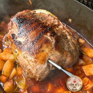 Nachdem das Gemüse angeschwitzt war, durfte der Braten zurück in den Dutch Oven. Deckel zu, indirekte Hitze – jetzt heißt es low & slow. Ich liebe diese Phase: man sieht nicht viel, riecht aber alles. Immer wieder kurz den Deckel geöffnet und den Braten mit dem Fond übergossen, damit er schön saftig bleibt.