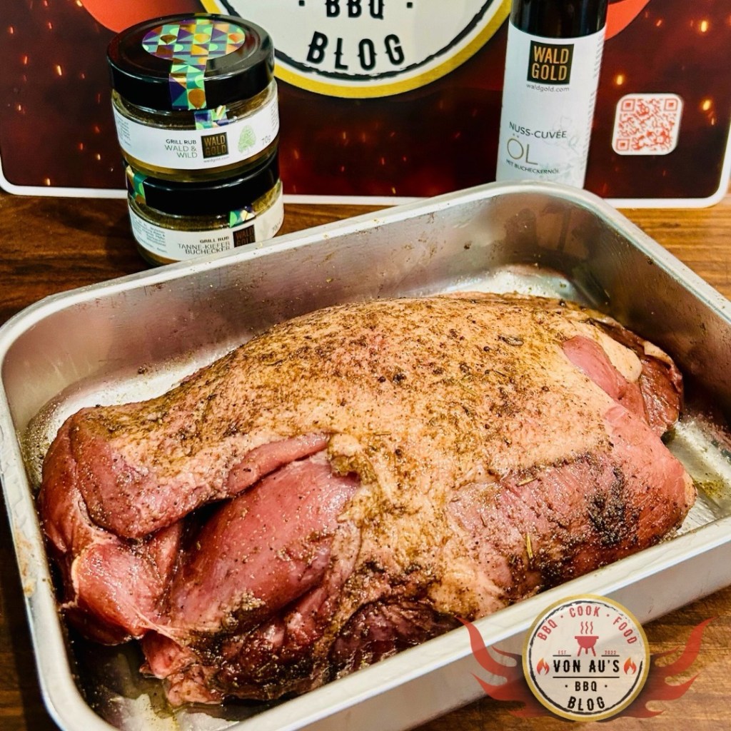 Der Braten (1,8 kg aus der Keule) wurde zunächst mit Nuss-Cuvée Öl eingerieben. Darauf kam der Wald & Wild sowie Tanne-Kiefer-Buchecker Rub, den ich großzügig einmassiert habe. Danach durfte das Fleisch über Nacht im Kühlschrank durchziehen.