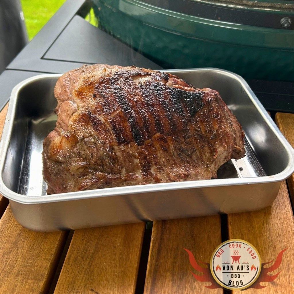 Am nächsten Tag habe ich das Big Green Egg auf 120–130 °C eingeregelt, aber bevor das langsame Garen starten konnte, gab es erst einmal eine kurze Direktgrill-Session.