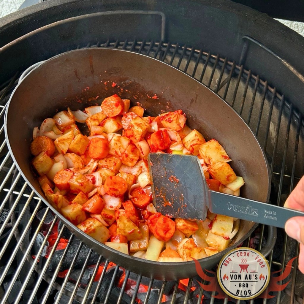 Nach dem kurzen Anbraten habe ich meinen Dutch Oven direkt auf den Rost gestellt. Darin wurden Zwiebeln, Möhren, Sellerie und Tomatenmark mit etwas von meinem Knoblauch-Öl – SPEZIAL angeschwitzt – etwas vom Rub auf das Gemüse gestreut, und schon verbreitet sich dieser herrliche Duft im Garten.