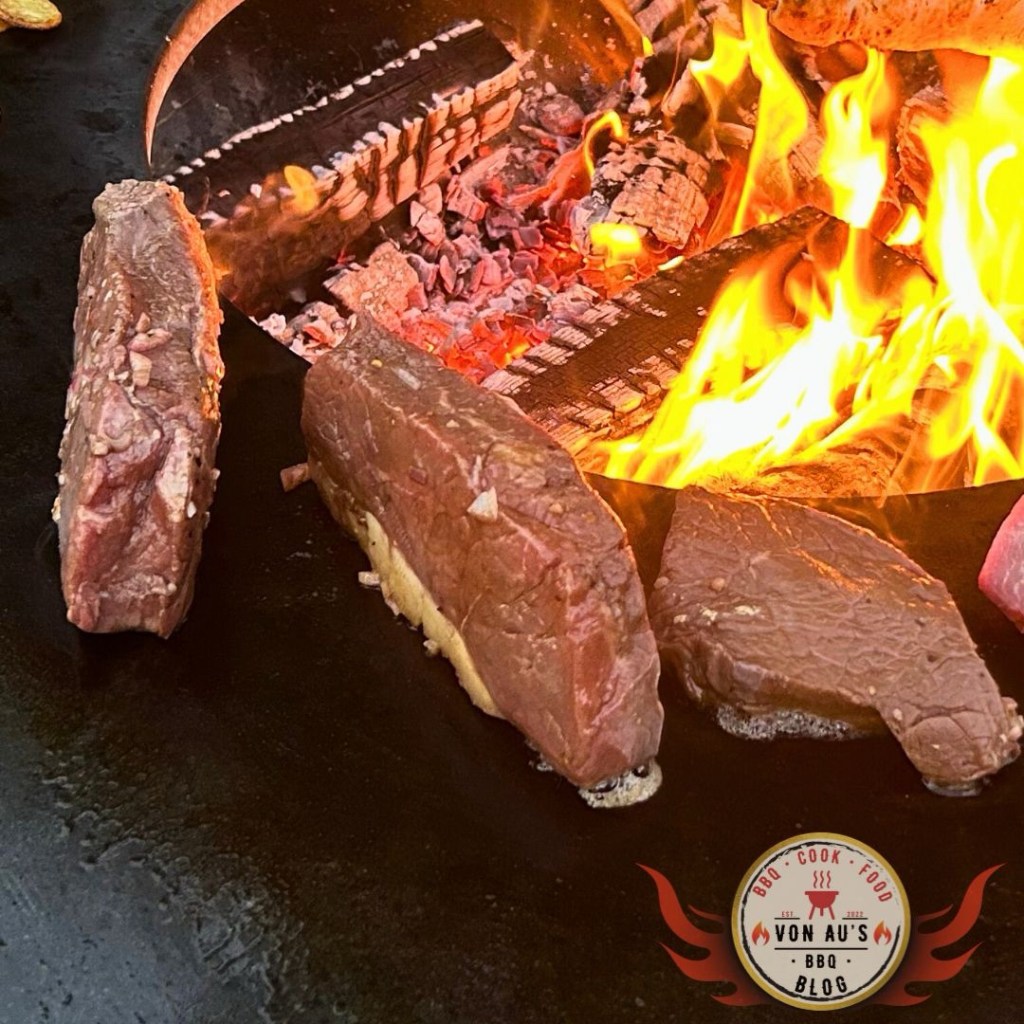Die Steaks kamen direkt auf die heiße Lavasteinplatte, 2–3 Minuten pro Seite, bis sie eine schöne Kruste hatten. Anschließend durften sie noch kurz indirekt nachziehen.