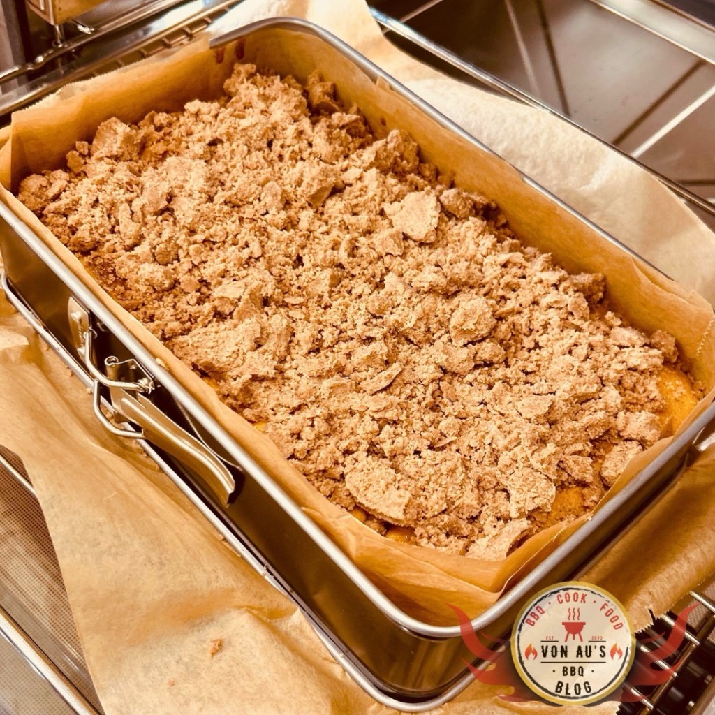 - Backofentür vorsichtig öffnen und die Crumble-Streusel gleichmäßig auf der Oberfläche verteilen.