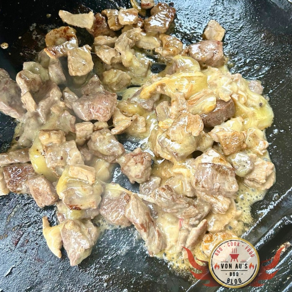 - Fleisch aus der Pfanne nehmen, beiseite stellen