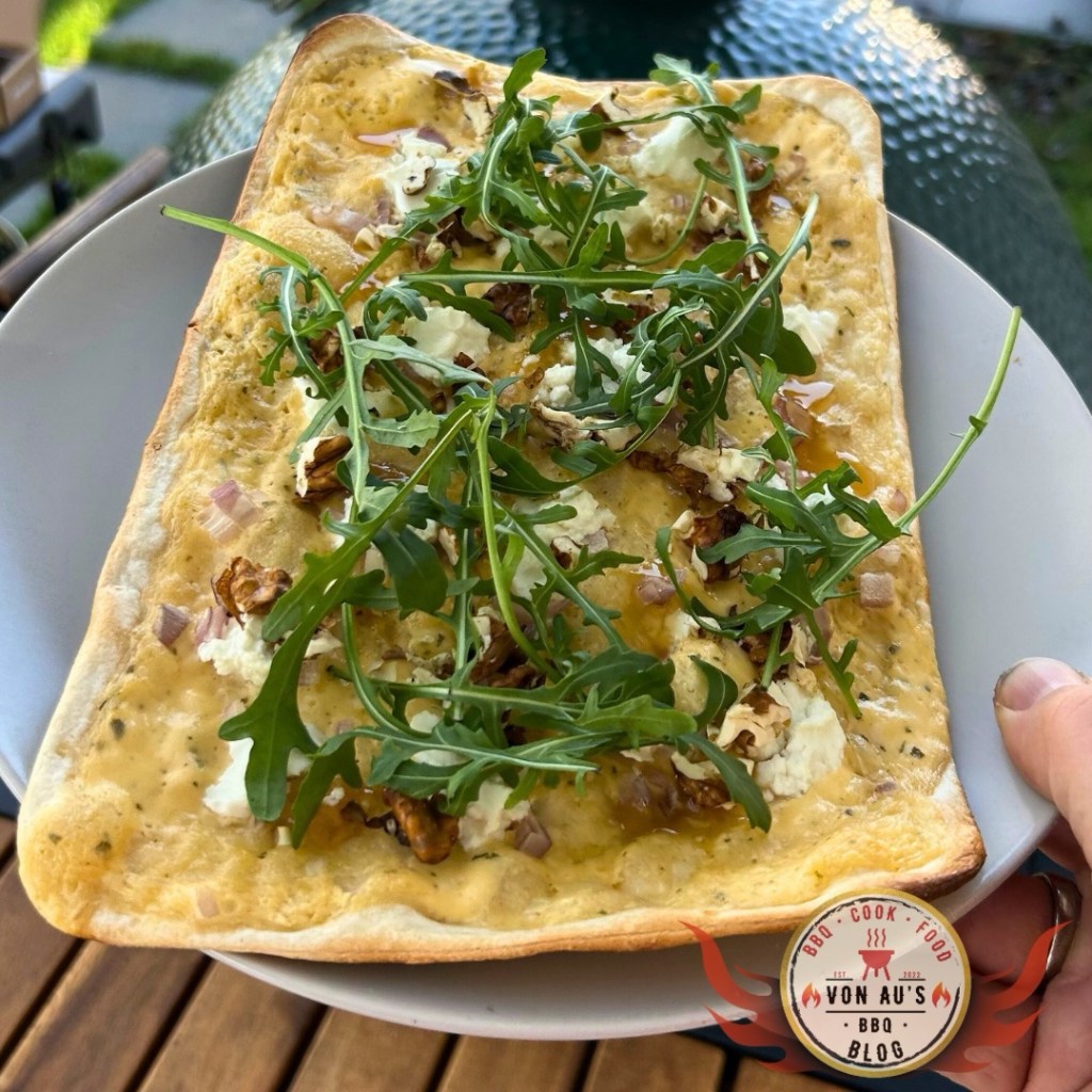 - Flammkuchen vom Grill nehmen, mit Honig fein beträufeln und mit frischem Rucola toppen.