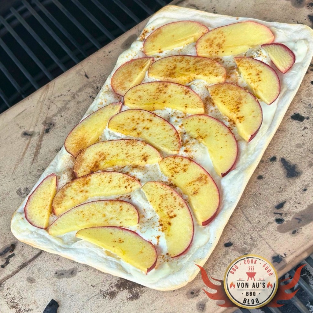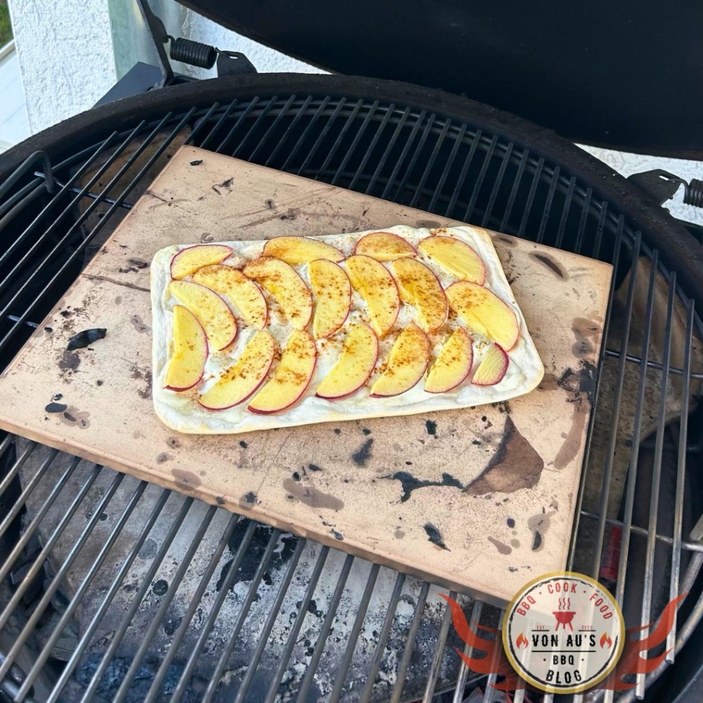 - Lege kurz vor dem Backen ein kleines Apfelholz-Chip auf die Glut – so bekommt das Dessert eine feine BBQ-Note, die perfekt mit Zimt und Apfel harmoniert.