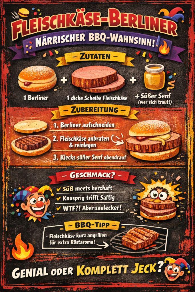 • Der Fleischkäse-Berliner ist kein Rezept für jeden Tag. Aber er ist perfekt für die närrische Zeit, wenn Regeln außer Kraft gesetzt werden und Essen auch einfach mal Spaß machen darf. Probier’s aus – und entscheide selbst: Genial oder komplett jeck?