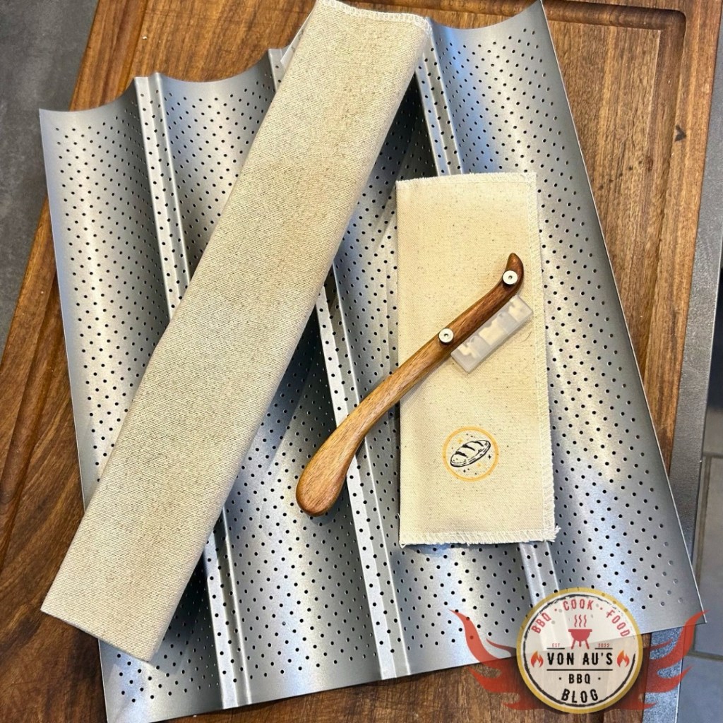 Set aus antihaftbeschichteter Baguette Backform inkl. Bäckerleinen u. Bäckermesser.